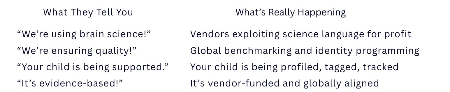 But behind the slick branding lies a deeper agenda. The SoR is not just a reading reform; it is a globalized, data-driven, and profit-laden Trojan Horse, carrying with it the machinery of behavioral conditioning, teacher de-skilling, surveillance tech, and UN-aligned indoctrination.